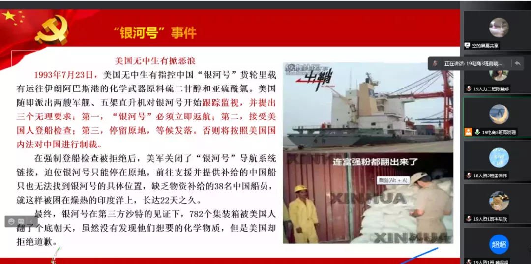 主讲人高晓珊同志首先讲述了“银河号”事件。1993年7月23日,美国无中生有指控中国载运化学武器原料并提出无理要求,中国在拒绝美国强制登船检查后,却被困在了燥热的大洋上,没有物资的补给,长达22天。最终,782个集装箱都被翻了个底朝天都没有发现美国所想要的化学物质,直到今天我们仍然没有收到来自美国的道歉。这让中国人意识到了中国多么需要强大起来!