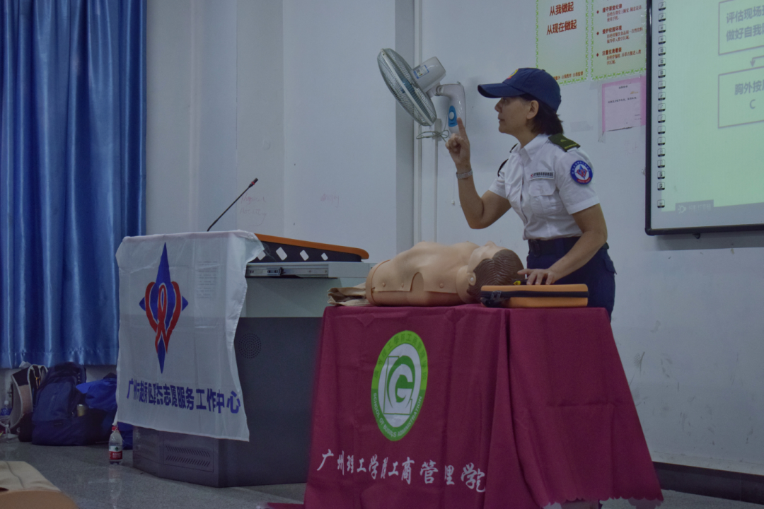 本次活动由广州市越秀区暐杰志愿服务工作中心的吴少冰老师主持,此次活动主题为“提健康素养,救人于危急”。吴少冰老师一开场就用风趣、幽默的语调,缓解紧张的教学氛围。她生动形象地授课风格,深深地吸引同学们的兴趣,并引导同学们学习相关的应急救护知识和进行相关的应急救护技能的培训。