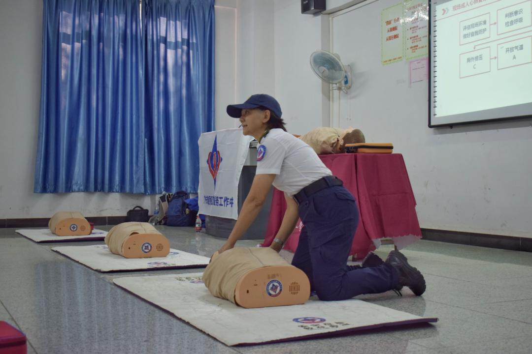 同学们认真听解后,并在吴少冰等老师一对一地指导下使用模拟人、AED除颤仪等教具进行实操。