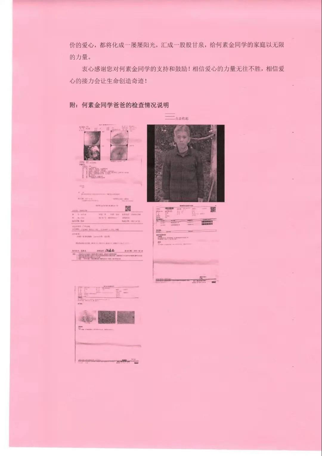 大家都知道人最宝贵的就是生命,人的生命只有一次。当你过着无拘无束的生活,享受着健康快乐的生命时候,你能想象一个柔弱的生命正在与病魔进行殊死的搏斗吗?残酷无情的病魔改变了她的生活,也给一个普通的家庭带来无尽的痛楚。何素金是我校suncitygroup太阳集团19市场营销8班的学生,家里三姐弟,年龄相仿,没有积蓄,他的爸爸(何达强,59 岁)今年8月开始说胃痛,吃不消东西,当时症状不太严重,9月的时候,爸爸说摸到腹部有包块,疼痛难忍,才到县医院检查,但是检查无果,不得不再去慈云医院做进一步检查,9月29日是在慈云医院检查胃镜,正值国庆期间,10月9日胃镜出结果,初步诊断为胃癌,具体情况慈云医生主治医师说要去广州进一步做免疫组化、CT等一系列检查。10 月15日在中山附属肿瘤医院(黄埔院区)做了检查,期间陆陆续续出报告。10月27日,中山附属肿瘤医院(黄埔院区)胃外科医生说,是常见腺体癌,整体早期局部晚期,已经有局部扩散,有手术机会,要先做化疗争取手术机会。手术以后也要经过漫长的化疗放疗、靶向治疗、免疫治疗等等,抗癌这条路很漫长,也很艰辛。