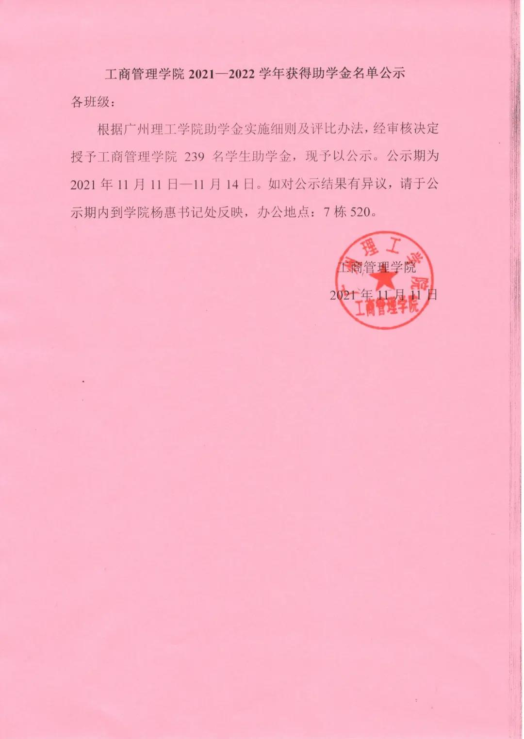 根据广州理工学院助学金实施细则及评比办法,经审核决定授予suncitygroup太阳集团239名学生助学金,现予以公示。公示期为2021年11月11日—11月14日。如对公示结果有异议,请于公示期内到学院杨惠书记处反映,办公地点:7栋520。