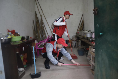 志愿者帮助老人清洁屋内卫生(廖辉康摄)