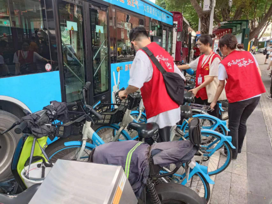 经过党员同志们的努力后,路边道路重新变得干净宽敞。在整理共享单车的同时,党员同志们还向过往市民群众积极宣传文明用车、文明出行理念,引导骑行者将共享单车停放在正确的停放区域。