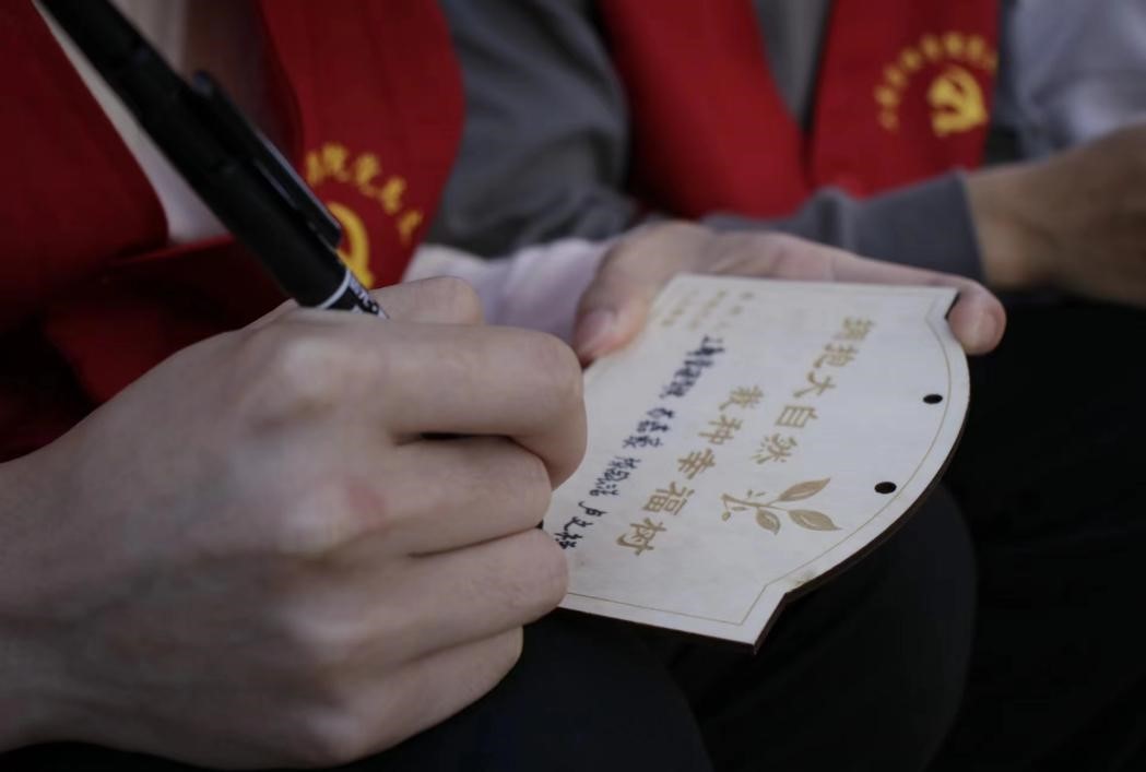 老师将带有寄语的牌子系在树苗上 梁敏亭摄