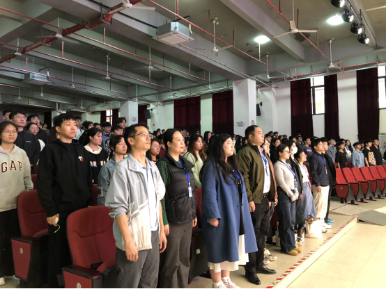 大会伊始,全体师生起立,奏唱中华人民共和国国歌。