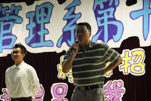 本系讯(通讯员:孟 闪)2014年4月15日晚7点30分,管理系第十一届模拟招聘会决赛,在六栋报告大厅拉开帷幕。出席本次比赛的领导有:管理系党总支书记杨晓文、管理系团总支书记钟劲。担任本次大赛的评委有:管理系老师王祥福教授、管理系老师李涛、李兴全。