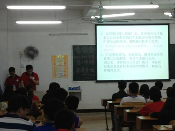 本系讯(通讯员:张浩铨)10月17日,为了让各班纪律委员进一步了解纪律部和更好地配合纪律部晚修检查和交收考勤表的工作,我系团总支学生会纪律部组织召开了“管理系2013-2014学年第一学期纪律委员会议”。我系辅导员林成园、团总支学生会主席团以及各班纪律委员出席了本次会议。