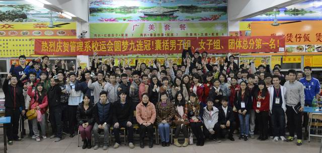本系讯(通讯员:詹佳贤)12月3日晚,我系院运会九连冠庆功宴在一饭二楼落下帷幕。此次活动是为了热烈庆祝我系在院第十一届运动会中取得九连冠佳绩,借此感谢运动员的拼搏、彩旗队的付出和我系团总支学生会全体成员的辛勤工作。管理系常务副主任伍曙、党总支书记杨晓文、团总支书记钟劲、办公室辅导员及办公室老师莅临现场。