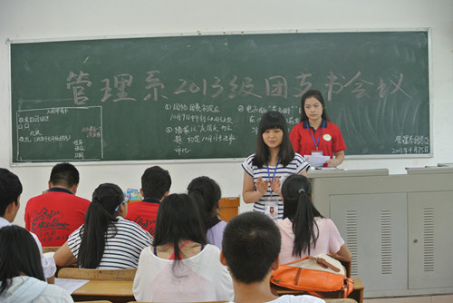 首先是由来自本人资行政123的团支书杨智荣同学为在座的13级团支书分享了他在大学生活中担任团支书的经验和心得。然后由团总支干事陆文聪,余敬敏分别介绍了团支书将要担任的职责和任务,其中主要包括:团档、团证的收集与注册、团费的收缴、团支部花名册的登记、新生申请入团或补办团证、团档的程序等;安排了接下一周的工作,收取2013级同学的团证团籍,团费;以及对国庆墙报工作进行安排,并现场解答新生团支书的问题;使团支书对自己的工作有所认识。