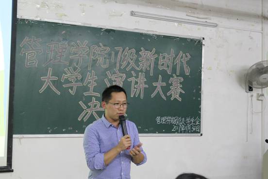 11月30日晚上,为活跃校园文化气氛,给同学们一个展现自我的舞台和提升自我的机会,我院于7栋418教室举行2017级新时代大学生演讲大赛。此次比赛的评委有办公室老师赵竹君老师、辅导员伍小英老师和往届演讲大赛优胜者;嘉宾有团总支书记黄伟剑老师、辅导员黄浩老师、团学主席团成员,主持人为学习部大一干事邝彩月、陈柏青。