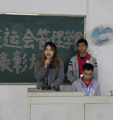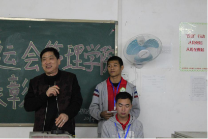 大会正式开始。首先,观看运动会视频,领略我院师生风采。其次,由运动员代表温琪琪发言,她表示代表学院参赛是件很幸福的事。然后,由党总支书记易国富、办公室主任肖柳、团总支书记黄伟剑、辅导员黄浩分别为运动员代表、彩旗队代表、拉拉队代表以及工作积极分子颁奖。会议最后由易国富书记上台讲话,他首先对学生的付出表达谢意,同时希望校运会等平台能历练我院团队精神,传承团队精髓并提高综合能力,最后期望我院再创佳绩。