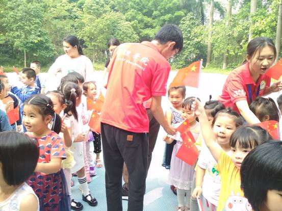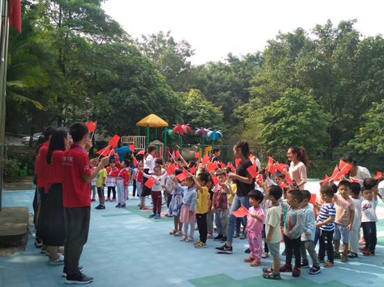 本次活动,我们通过给小朋友分发国旗、教他们唱过歌的形式,在他们身上植下爱国的种子,也传达了我们对祖国花朵的热爱和关心。
