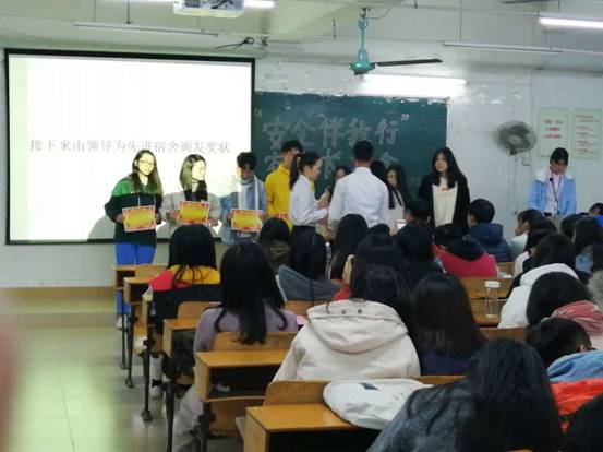 首先,由主持人温晓静宣布大会正式开始并介绍到场嘉宾,其次是全体一起观看宿舍安全视频。大会第四项是由院宿委干事模拟宿舍检查流程,会议第五项议程是观看先进宿舍的照片并由伍小英老师为先进宿舍颁发奖状,接下来是进行有奖问答,最后由指导老师黄浩做会议总结,他表示现在没收违规电器已经不用交检讨书,但是会有记过处分记录在学生档案里面,而且为了学校宿舍安全,大家不能使用违规电器。
