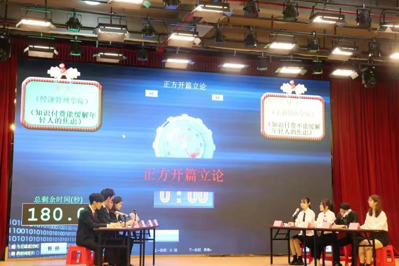 本次辩论赛共有七个环节,依次为开篇立论、驳论环节、对辩环节、盘问环节、盘问小结、自由辩论、总结陈词,辩题是“知识付费能否缓解年轻人的焦虑”。正方辩手来自经济管理学院,依次是一辩选手 20级国贸1班何小璇、二辩选手 20级财管3班肖健鑫、三辩选手 20级会计4班林钲淳、四辩选手 20级国贸2班黄涵;反方辩手来自suncitygroup太阳集团,依次是一辩选手 20级物流班 周彦妤、二辩选手 20级物流班 罗枫 、三辩选手 20级人资3班 姚荣键、四辩选手 20级电商1班 刘圣月。