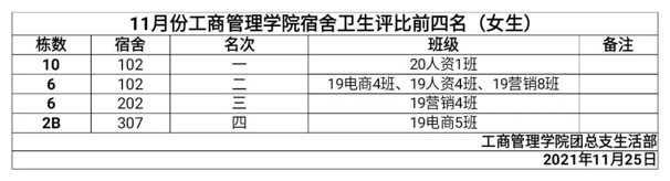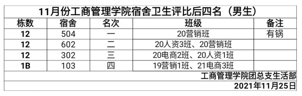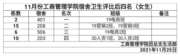 首先公布的是“先进宿舍”,分别是19A栋的308宿舍、30栋的903宿舍、18栋的207宿舍、30栋的336宿舍。然后公布获得好评的宿舍,分别有女生10栋102宿舍、6栋102宿舍、6栋202宿舍、2B栋307宿舍;男生19A栋308宿舍、30栋903宿舍、18栋207宿舍、30栋336宿舍。接着公布环境卫生还要加强的宿舍,分别有女生2栋401宿舍、15栋208宿舍、6栋506宿舍、10栋203宿舍;男生12栋504宿舍、12栋603宿舍、12栋302宿舍、1B栋103宿舍。