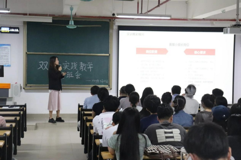 校内导师张锰强调实践教学的相关制度,包括学分认定、实践实训教学形式、校企专项师资团队的管理职责等,同学们将通过实训学习营销、电商专业知识,并通过实操模拟、正式上线等环节,踏出迈入互联网电商行业的第一步。实训项目不仅提供纵向发展机会,如客服代表、项目总监等职位,还有横向发展路径,包括AI训练师、商品专员、客服专员等。张锰老师表示校院领导高度重视校企合作的实践教学并作出重要指示,校企双方对实践教学作了全面而严谨的部署,希望同学们珍惜实践学习机会,最后预祝双十一实践实训圆满成功。