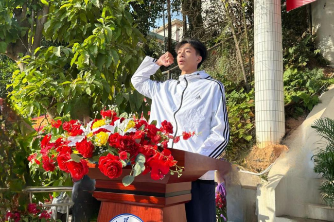 经济管理学院陆俊宇代表运动员进行宣誓,他承诺全体运动员将恪守赛事规则,秉持尊重对手、团结协作的精神,以积极和热情的态度参与运动会,展现学院的体育风采和精神面貌。