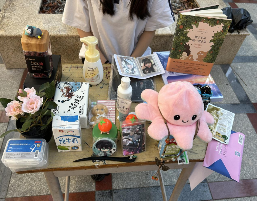 (摊主与同学介绍义卖物品 吴秋漫 摄)