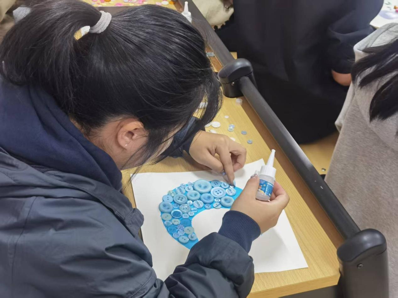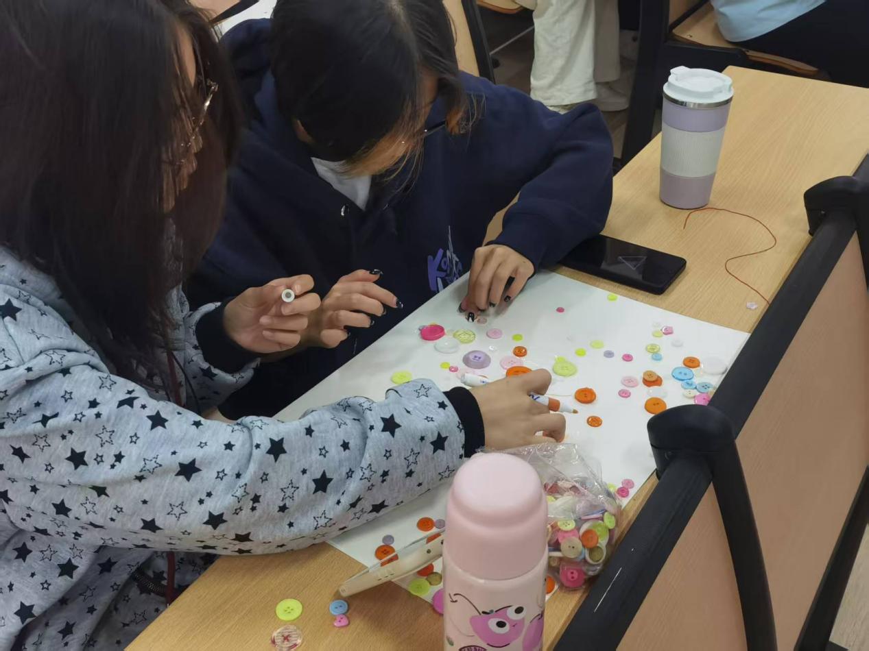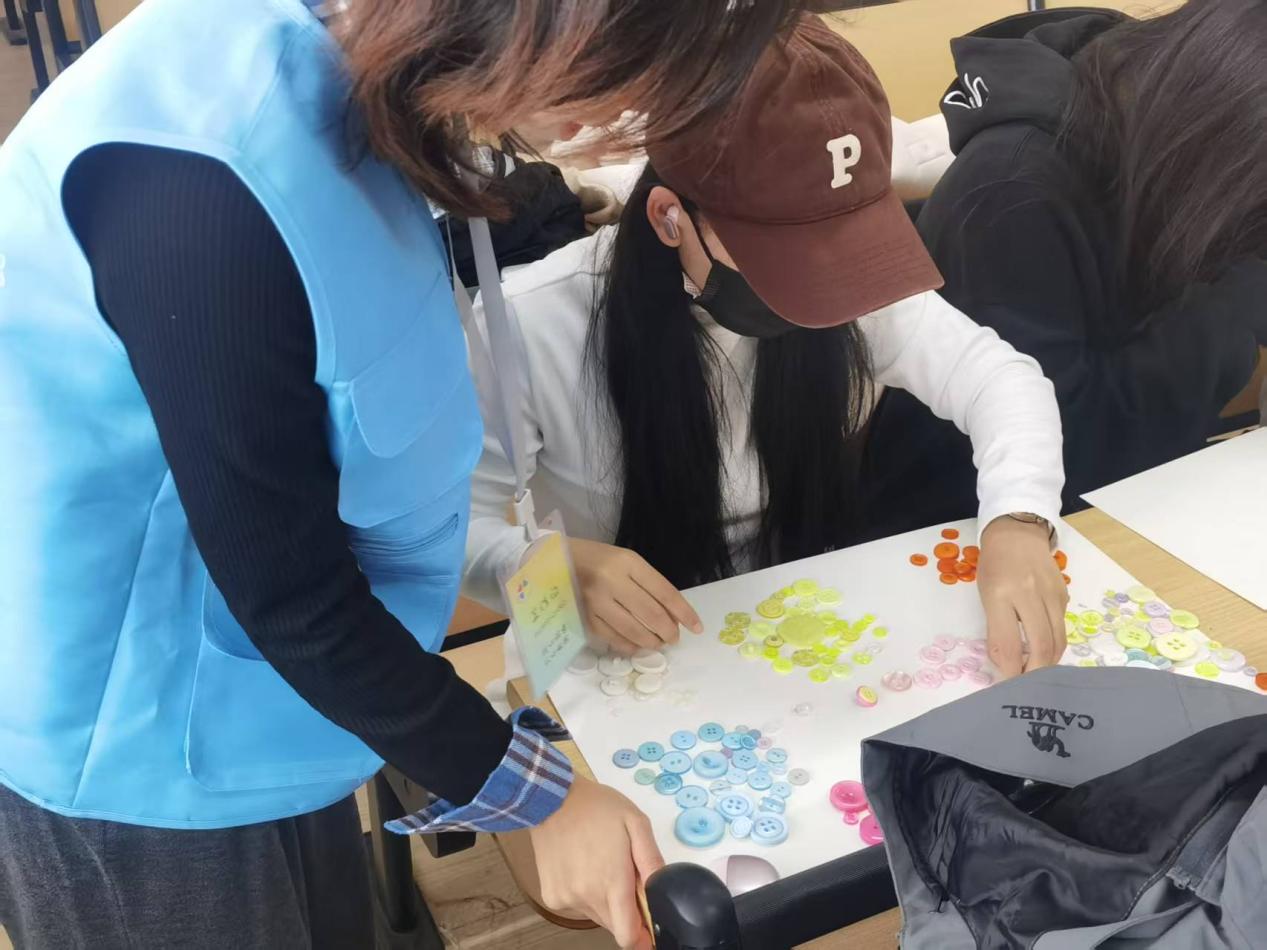 活动伊始,心理辅导站工作人员为参加活动的同学进行活动内容的讲解。讲解完毕,同学们开始陆续在贴画纸上利用纽扣,胶水等材料进行个性色彩的创作。
