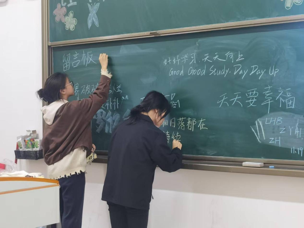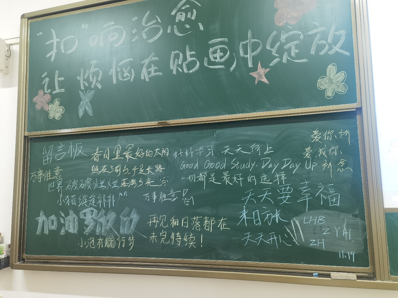 最后,大家将所绘画出来的作品拿在自己手上展示合影并在黑板上写下对未来的期许和美好祝愿,心理辅导站的成员进行善后工作。本次活动不仅帮助同学们在繁忙的学业中放松心情,也让参与者更好地疗愈自我,提升社交和学习效率以促进个人成长。