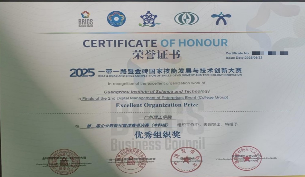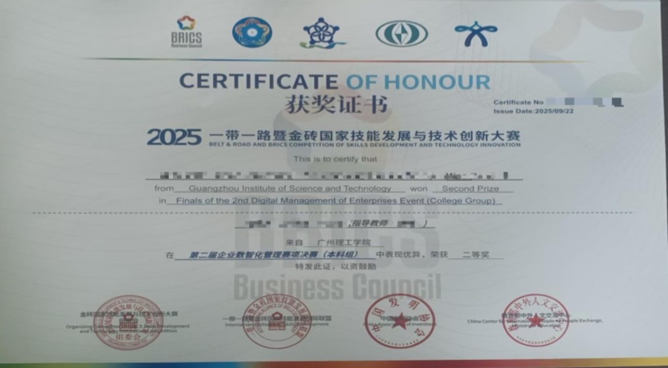 由胡丽美、陈健诚、尹乔烽三位同学组成的“广理砺锋剑”队在苗增老师指导带领下奔赴赛场,团队凭借着扎实的数据分析能力,出色的决策运营水平和默契的团队协作竞赛,最终斩获全国总决赛二等奖(银牌),指导老师苗增获评“优秀指导教师”,学校荣膺“优秀组织奖”。这三项荣誉,既是对师生团队卓越表现与辛勤付出的直接肯定,也是对学校在组织保障与人才培养方面扎实工作的充分认可。