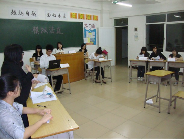 本次活动历时三周,分为三个阶段:策划与培训阶段、排演阶段、正式庭审阶段。第一阶段,拟定出全套方案,针对学生具体情况精选出最佳模拟案例,并组织学生进行“模拟活动”规则的培训。同学们怀着浓厚的兴致,在老师的帮助下,迅速掌握了法庭庭审的程序和规则。第二阶段,100多名学生被分成四个小组进行训练,每小组独立模拟法庭庭审,以司法审判中的法庭审判为参照,模拟审判一个精选案件。同学们扮演法官、书记员、法警、律师、原告、被告、证人,即热情又严谨,忙得不亦乐乎又保持了秩序井然,为正式庭审打下了坚实的基础。第三阶段,正式庭审,同学们扮演各自的角色,围绕一起因借款而引起的故意伤害索赔案进行了审理。整个庭审过程主要由法庭调查、法庭质证、法庭辩论、合议庭宣判等程序构成,严格遵循了民事诉讼程序,力求规范化。而案例材料也具体直观,具有很强的现实意义,与同学们的学习生活密切相关。审判长庄严宣判庭审开始,同学们收起了青春年龄的活泼雀跃,在肃静的法庭里面,从原告义正词严的指控到被告条理清晰的反驳,从咄咄逼人的法庭质证到辩护人的据理力争,一个个年轻的声音,奏响着法律平等与公正的精神;旁听的同学们,无不浸沐其中,仿佛正在经历一场现实中的审判。整个过程结构紧凑、高潮迭起,而正义天平始终稳如磐石,审判长的判决宣告让人心服口服,最后法槌敲响,庭审结束,全场响起了一阵热烈的掌声。掌声之后指导老师进行点评,高度评价同学们认真而精彩的表现,本次活动圆满结束!