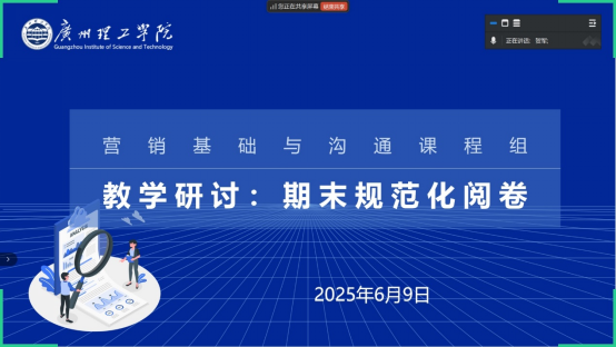 (王经梦)2025年6月9日,市场营销系营销基础与沟通课程组组织组内全体任课教师在线上召开"期末规范化阅卷专题研讨会"。本次研讨会重点围绕期末阅卷的标准统一、流程优化和质量监控等核心议题展开深入探讨,旨在进一步规范阅卷流程,提升评阅质量,确保考试评价的公平公正。本次研讨会由课程组负责人贺军老师主持,参会课程组成员有:贺军、苗增、谢汝铃、李玉权、廖玥莹、颜泽东、董秀海、王经梦。