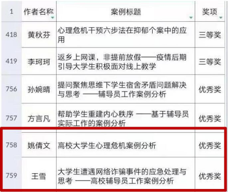 两位老师结合日常学生工作积累经验,总结不足,记录学生工作的点点滴滴,制成学生工作案例。辅导员作为大学生思想政治教育的骨干力量,是学生成长成才的人生导师和健康生活的知心朋友。在实际工作中,辅导员的理论素养、道德品行、人生理想、见识学识直接影响着学生的思想水平、政治觉悟、道德品质和文化修养。因此辅导员通过每次记录学生工作案例,更好地反思、总结工作,推进工作,努力成为更好的学生思想引路人!