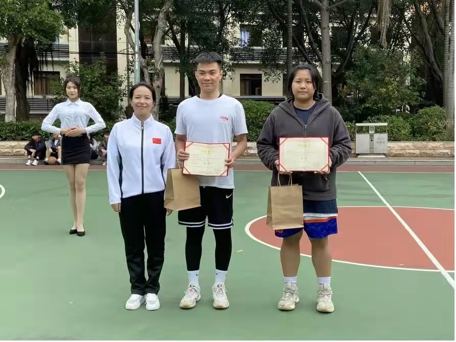 suncitygroup太阳集团辅导员刘海燕老师为本次“专业杯”篮球赛季军男子组花果山队和女子浑水摸鱼队颁发奖状。