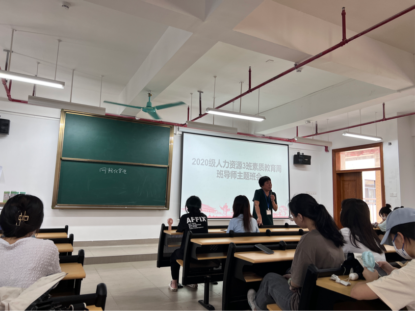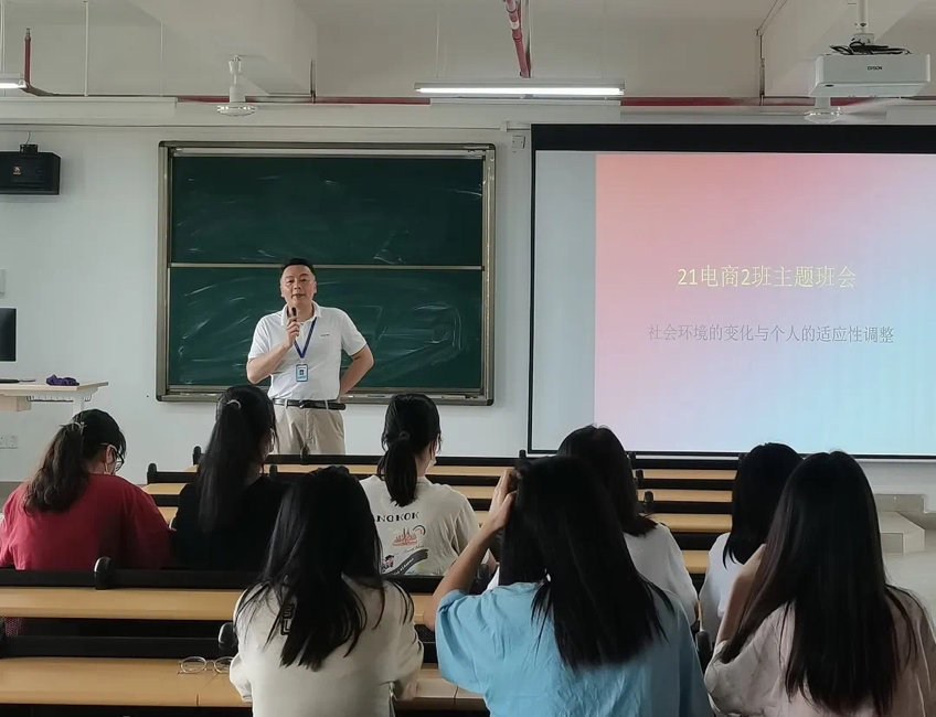 21电商2班班导师李涛老师则是以社会环境的变化与个人的适应性调整为主题开展此次班会,在学业学习当中,第一个方面是关注欧洲转型,把线上和线下的体验进行融合、打通人流和信息流的相关政策,电商专业还不太完善,如农产品管理,对于我们来说仍具有操作空间;第二个方面是对于个人考研考公、创业,要有承担失败的勇气,并根据自己所求选择在当地发展,为同学们未来就业进行了指导。