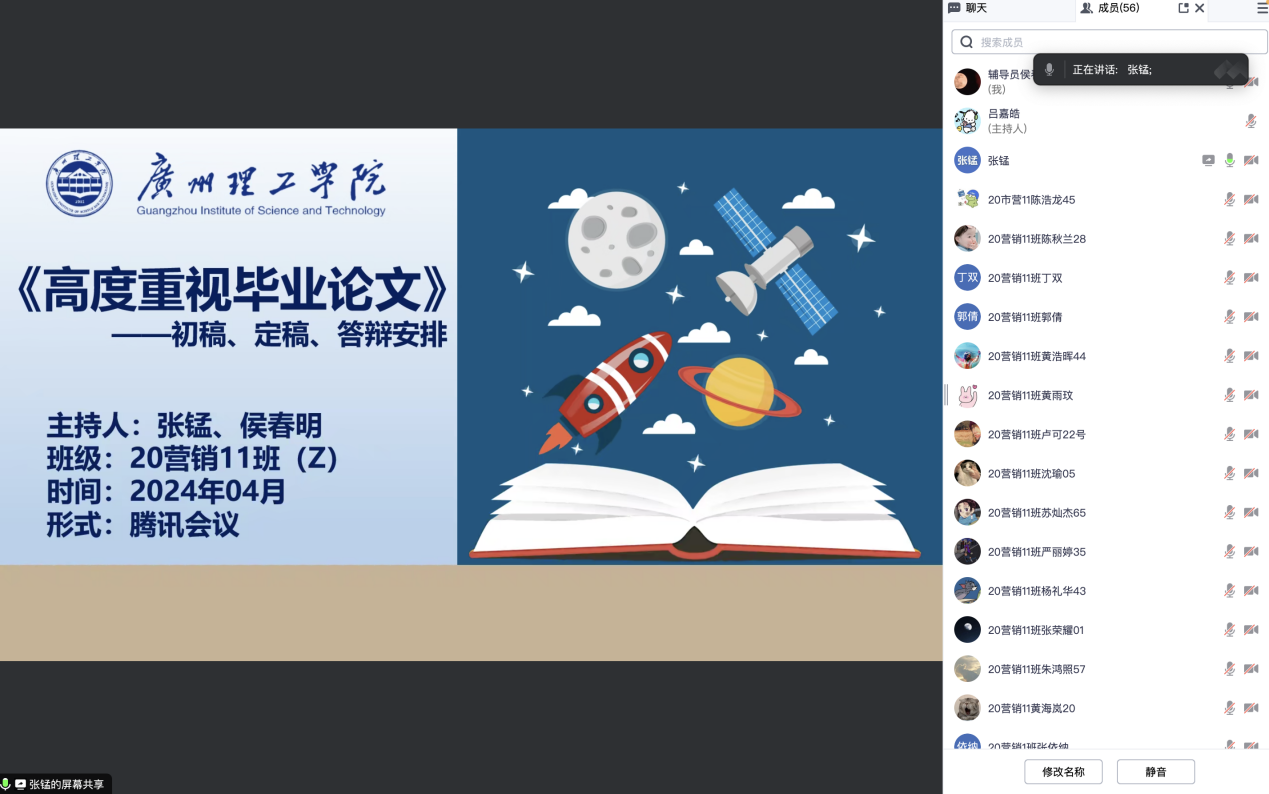 在论文管理方面,班导师张锰老师讲述了毕业论文的重要性和紧要性,让同学们都要重视这项工作,并为学生提供个性化的研究指导和写作建议。最后嘱咐同学们要对论文进行严格审核,杜绝一切形式的抄袭行为,确保学术成果的独立性和真实性。