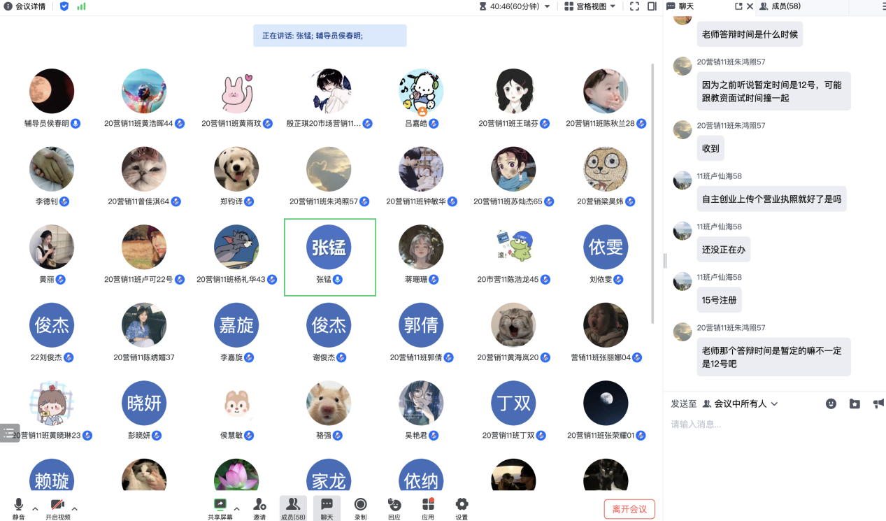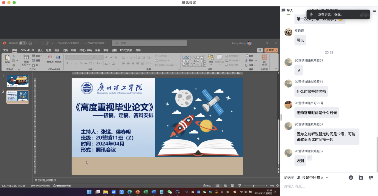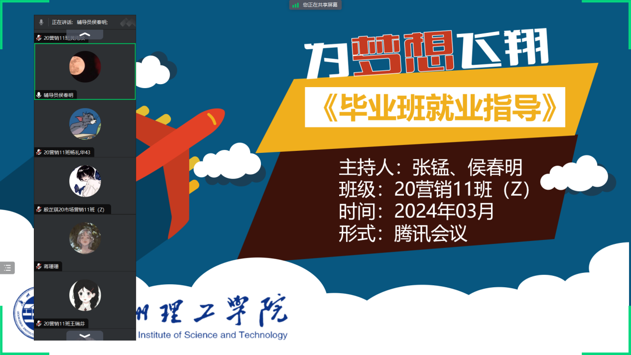 (侯春明)4月10日,班导师张锰老师和辅导员侯春明老师通过线上会议为20营销11班毕业班开展了毕业生就业指导会。此次会议旨在帮助即将走出校门的毕业生们更好地适应市场需求,提供有效的求职策略,助力他们顺利开启职业生涯,同时加强毕业生论文管理工作,指导他们早日完成毕业论文。