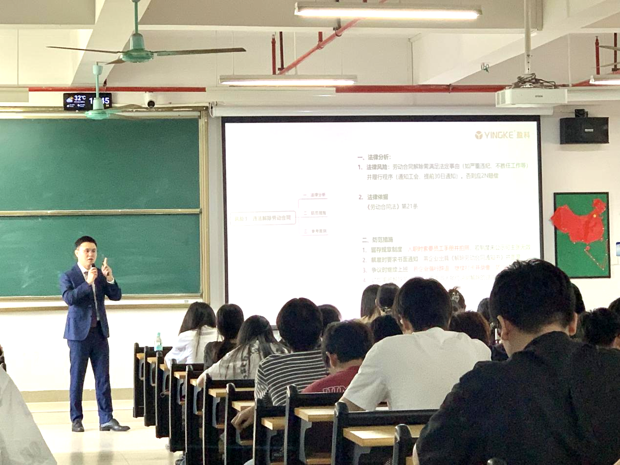 讲座伊始,林晓军律师以近年来频发的应届毕业生初入职场的真实案例切入,从“毕业即维权”“试用期不合规”等案例,引发同学们对求职法律风险的高度关注。他指出,随着用人市场化的发展,许多大学生作为职场“新手”,极易在签约、试用、离职等环节中陷入法律误区。为帮助同学们增强风险识别能力,林晓军律师围绕劳动合同签约、试用期管理、违约责任、薪酬约定、加班时间等多个环节进行了详细讲解。