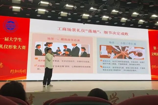 在团队展示环节,队员们以标准的礼仪站姿和坐姿亮相,瞬间吸引全场的目光;在微情景剧环节,队员们通过“模拟商务洽谈”与“模拟工作汇报”两个场景,将商务礼仪的规范与魅力诠释的淋漓尽致。从名片的规范递接到汇报时的得体表达,队员们凭借精准的肢体语言和专业的职业素养,赢得评委的广泛认可。