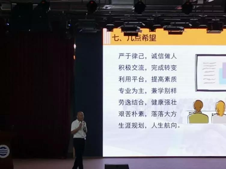 李培祥院长在最后提出了七点希望:严于律己,诚信做人;积极交流,完成转变;利用平台,提高素质;专业为主,兼学别样;劳逸结合,健康强壮;艰苦朴素,落落大方;生涯规划,人生航向。