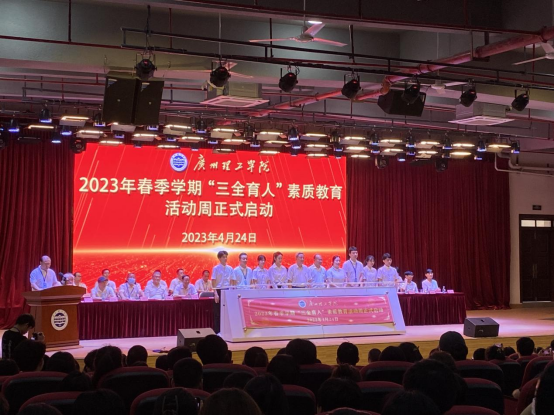 (邓思思 何玟静)4月24日8点30分,广州理工学院于13栋1号报告厅举行“三全育人”素质教育周启动仪式。代表发言,以进一步推动素质教育向纵深发展,展示我校共同参与大开放的素质教育新格局。校长胡社军、党委书记黄圣诚、常务副校长伏焕昌,党委副书记、纪委书记、副校长胡思虎,党委副书记、副校长肖海,副校长张世梅、张日新,各机关职能部部长,各二级学院院长、党总支书记和师生代表参加本次启动仪式。学校党委书记黄圣诚讲话,他提出要重视对学生的思想道德素质、能力的培养,实现立德树人常态化。最后,他预祝“三全育人”素质教育周取得圆满成功。