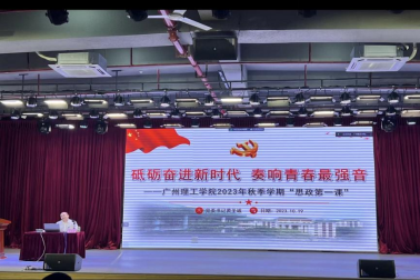 (林舒婷 鄢璐)10月19日下午,广州理工学院党委书记黄圣诚于13栋1号报告大厅讲授“思政第一课”,深入学习贯彻习近平新时代中国特色社会主义思想和党的二十大精神,坚持用马克思主义中国化时代化的最新理论成果武装青年学生,切实发挥思政育人作用。工商学院派学生代表前去报告厅现场上课,其他学生在分会场进行学习。