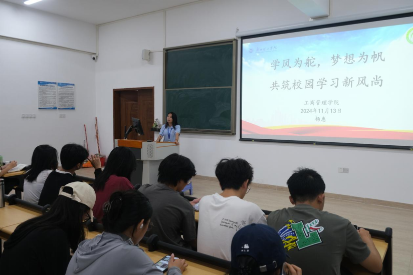 2024年11月13日下午4:30分,广州理工学院suncitygroup太阳集团在惠州校区1栋408课室举办了一场以“学风为舵,梦想为帆——共筑校园学习新风尚”为主题的活动,目的在于加强校园学风建设,激发学生的学习热情。2024级辅导员、全体同学参加,党总支书记杨惠主讲。