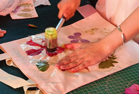 在工作人员的积极引导下,同学们纷纷地拿起工具,投入到这场充满创意和乐趣的植物拓染活动中。他们或从校园内亲手拾取斑斓的花草,或选用活动现场提供的植物素材,在帆布袋上进行色彩的交汇。随着敲打的动作,植物的汁液在布料上晕染开来,形成了一幅幅独具匠心的作品。