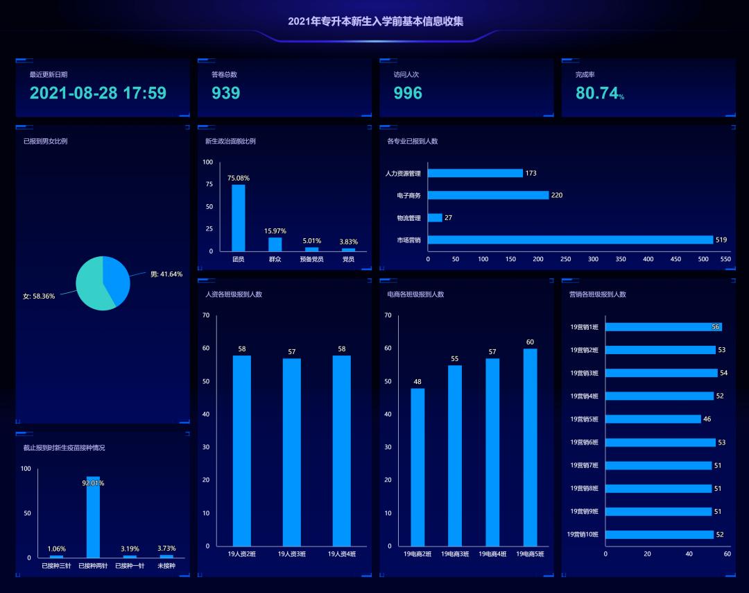 为了更好地收集新生信息,我院在本次迎新工作中运用相关平台,对新生报到的数据进行加工和处理,让新生报到的数据实时化,可视化,直观化地呈现,有利于为迎新全环节人员提供实时新生报到情况以及避免助班开学后二次收集信息的工作,减轻助班的工作负担。以下为我院2021年专升本新生报到详情数据(数据截止至2021年8月28日18点00分)