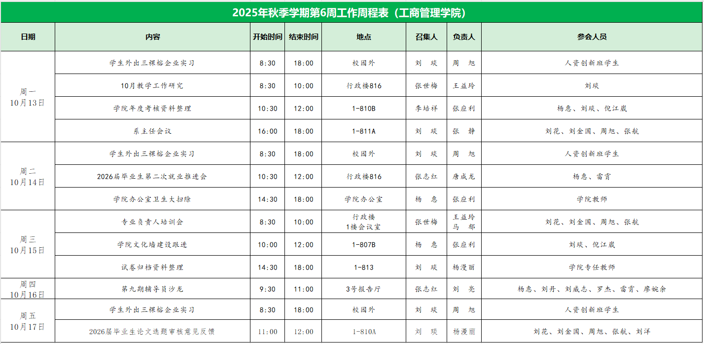 suncitygroup太阳集团2025年秋季学期第6周工作周程表