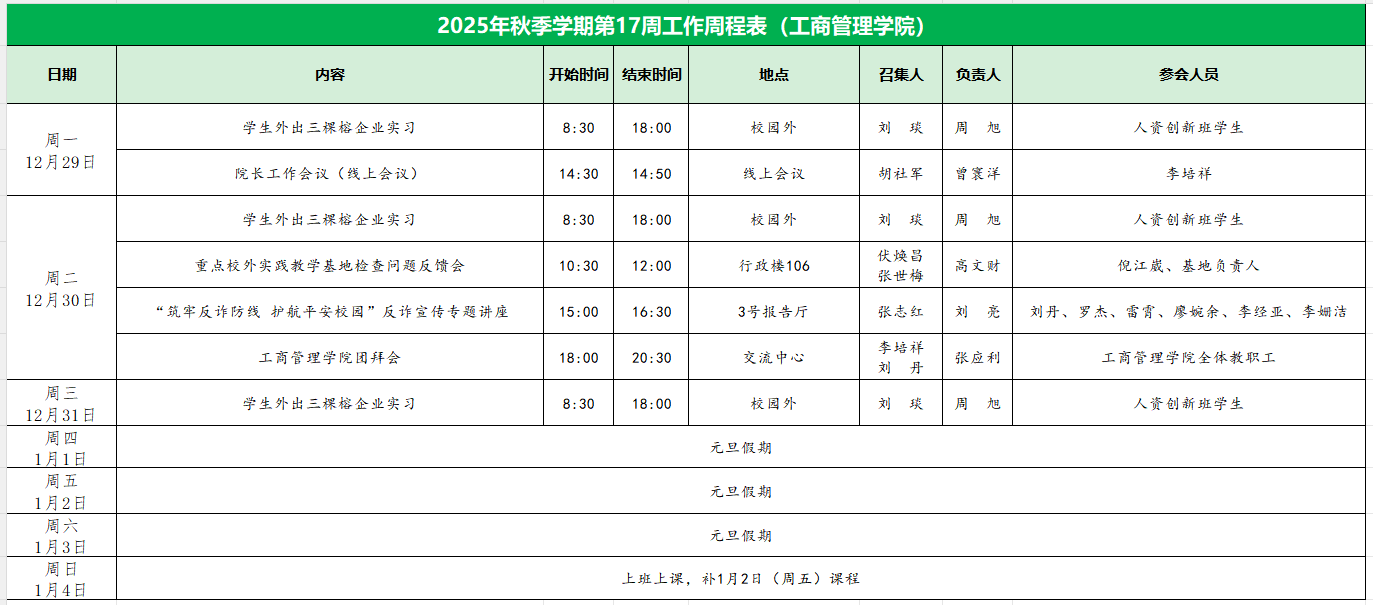 suncitygroup太阳集团2025年秋季学期第17周工作周程表