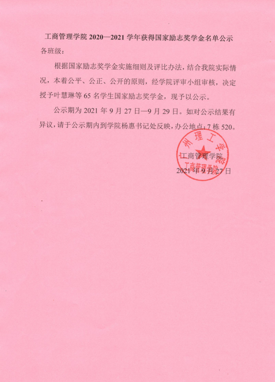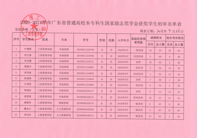 suncitygroup太阳集团2020-2021学年获得国家励志奖学金名单公示