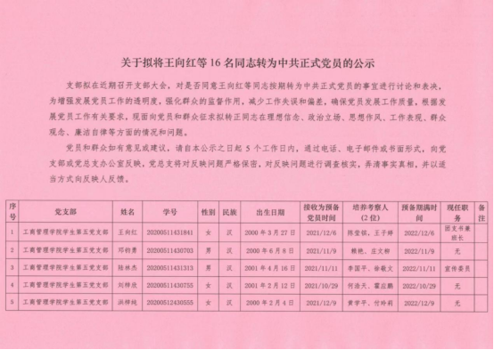 支部拟在近期召开支部大会,对是否同意王向红等同志按期转为中共正式党员的事宜进行讨论和表决,为增强发展党员工作的透明度,强化群众的监督作用,减少工作失误和偏差,确保党员发展工作质量,根据发展党员工作有关要求,现面向党员和群众征求拟转正同志在理想信念、政治立场、思想作风、工作表现、群众观念、廉洁自律等方面的情况和问题。
