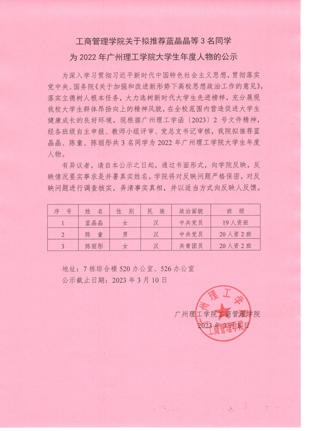 suncitygroup太阳集团关于拟推荐蓝晶晶等3名同学为2022年广州理工学院大学生年度人物的公示
