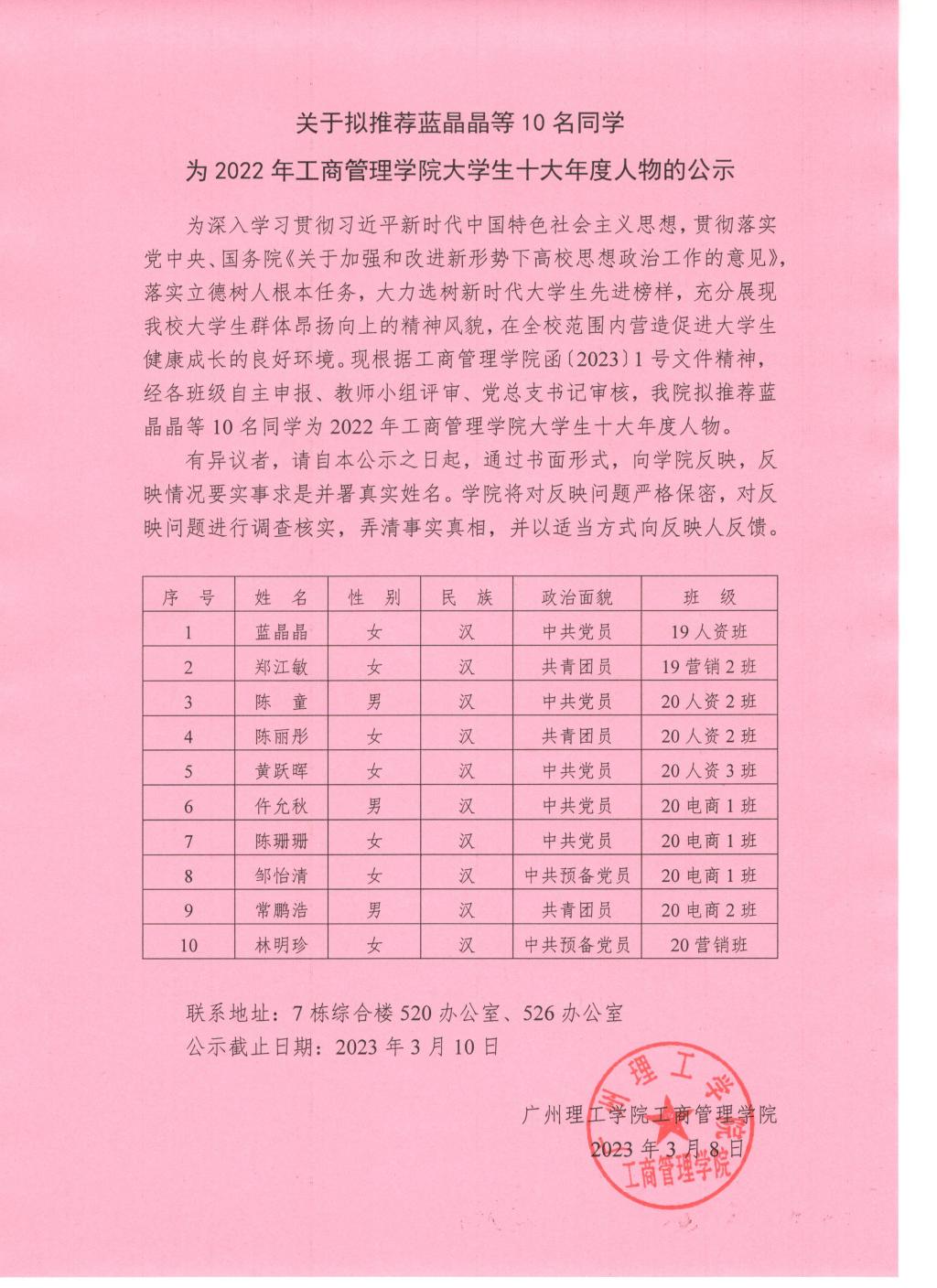 关于拟推选蓝晶晶等10名同学为2022年suncitygroup太阳集团大学生十大年度人物的公示