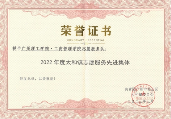 (邱晨曦,吴海宁)3月9日,广州理工学院·suncitygroup太阳集团志愿服务队被共青团广州市白云区太和镇委员会授予“2022年度太和镇志愿服务先进集体”称号。
