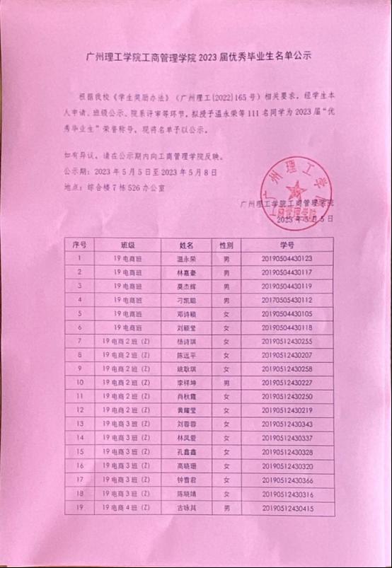 根据我校《学生奖励办法》(广州理工{2022}165号)相关要求,经学生本人申请、班级公示、院系评审等环节,拟授予温永荣等111名同学为2023届“优秀毕业生”荣誉称号,现将名单予以公示。