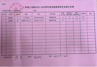 根据《广州理工学院学生处关于印发《2022-2023学年奖学金评比工作方案》的通知》(广州理工学函〔2023〕182号):由本人提出申请,我院对符合要求的国家奖学金申请材料进行审查,确定陈丽彤、吕嘉皓两位同学为我院国家奖学金候选人,并予以公示,公示期2023年9月20日-9月22日。如对评定结果有异议,请在公示时间内向李欣怡或杨惠书记进行实名反映。办公地点:李欣怡--7栋526、杨惠--7栋520。