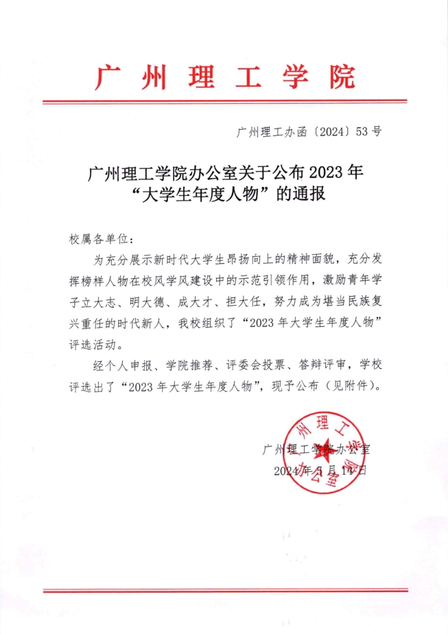 关于公布2023年“大学生年度人物”的通报